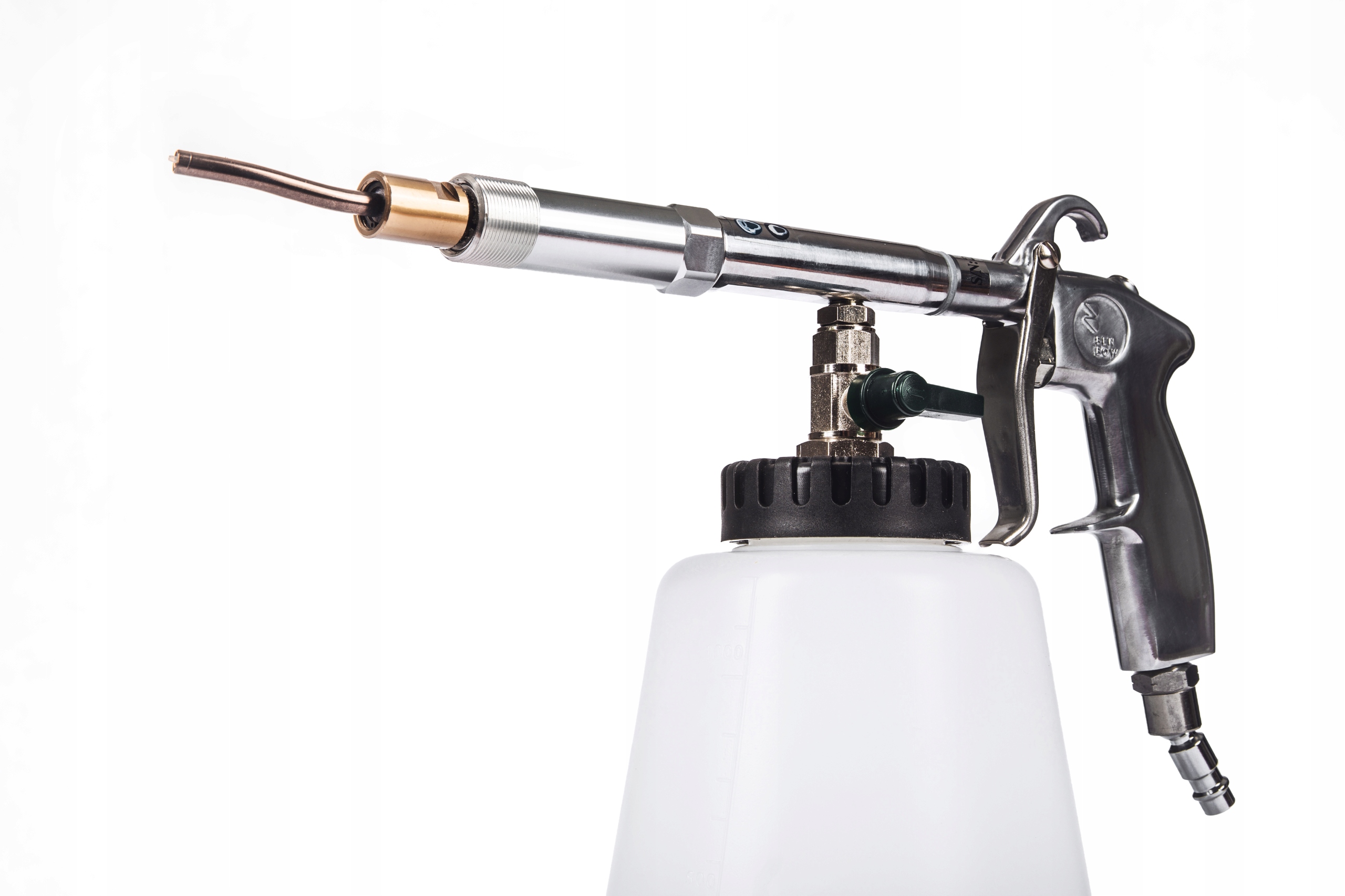 - Prosta obsługa - wlej płyn (gotowy do użycia lub rozcieńczony koncentrat) i podłącz go do kompresora. Za pomocą małego kranu możemy dozować ilość płynu aplikowanego z dyszy, a następnie naciśnij spust.